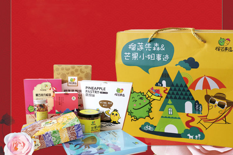 套餐一:榴莲饼、芒果酥饼、桂圆肉、深海鱼骨、椰子饼、榛子松塔、蜜汁黄花鱼、花果茶